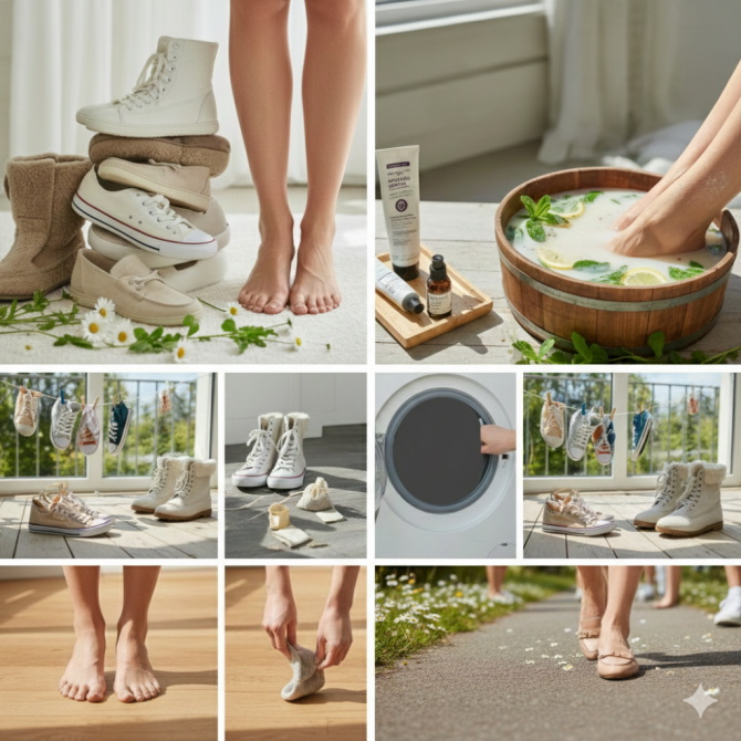 Problem: Unsere Füße waren monatlich in Leder und Wolle eingesperrt. Ergebnis? Trockene Haut, müde Gelenke und Schuhe, die ein bisschen „muffig“ aus dem Schrank grüßen.